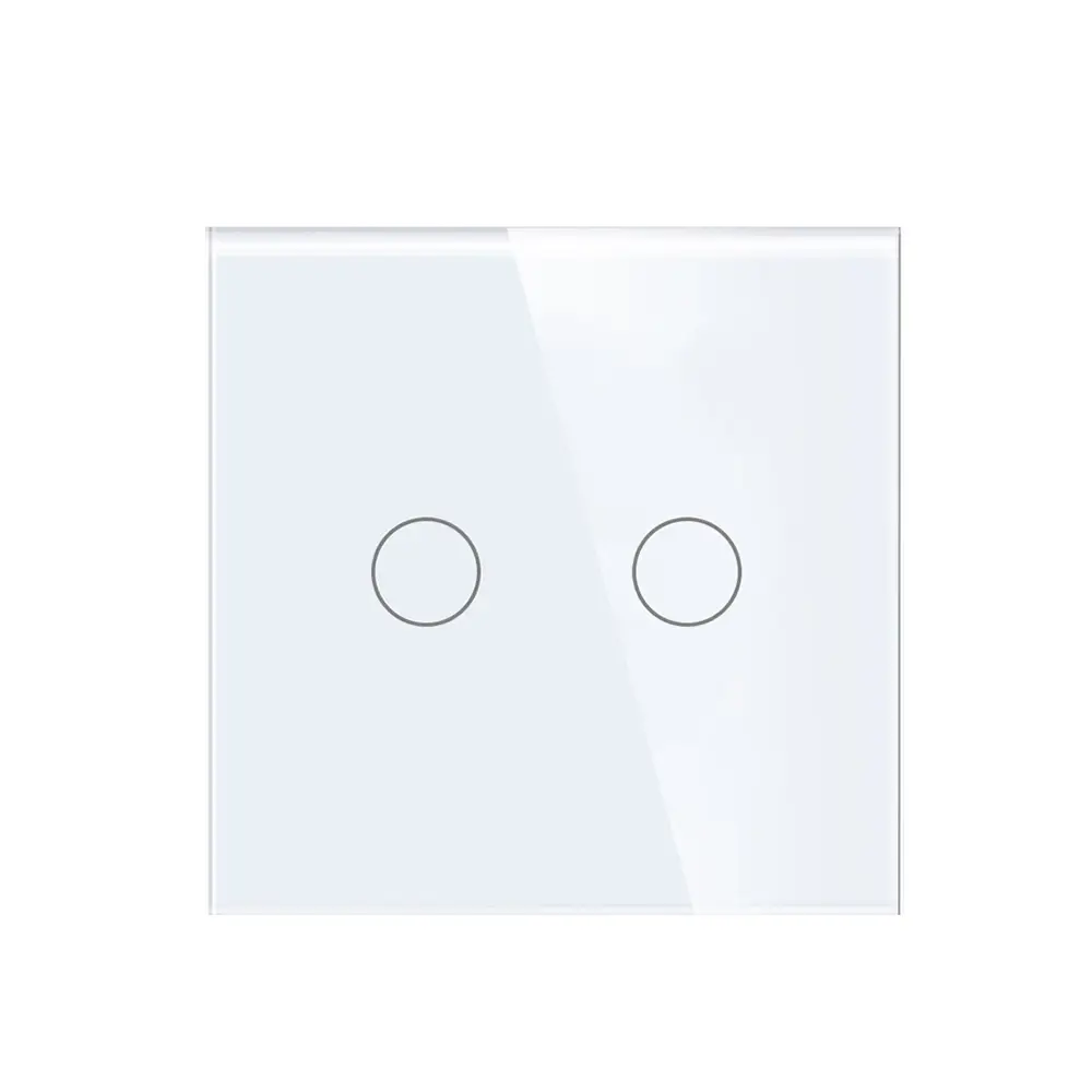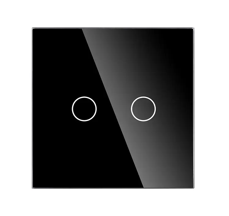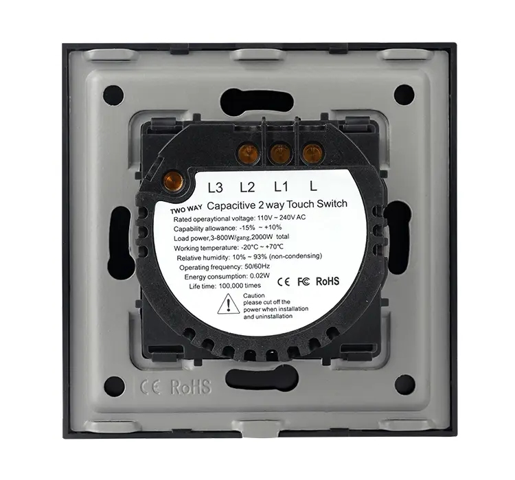 2 gang 2 way SCR (Silicon Controlled Rectifier) version touch switch, this switch can directly replace the 2 gang old mechanical rocker switch in your home, extra neutral line is no need to be wired with. required touch switch can work very stable when it’s turned off. For the working voltage, it is 110V-240V A.C. 50/60Hz, the loading electrical power is 1000W, and 500W for the resistive load. It can work in the environment of temperature from -20℃ to 70℃ and the relative humidity is from 10% to 93%. The stand by electrical power can meet 0.02W. You can just touch the glass panel to control the lights. The completed product consists of a tempered glass panel, a touch module, metal bracket and two mounting screws, which they can be installed together through the metal bracket on the wall by your local electrician. The panel is made of tempered glass which is in 86mm86mm size and 4mm thickness. This size can be used in most of European countries and some Asian countries. The finish is glossy and the edges are chamfered. This makes the glass panel look modern, clean and delicate. It’s waterproof, explosion-proof and scratch-proof. About the touch module. The module shell is made of fire-retardant Polycarbonate material, the outer size is about 50mm50mm and 25mm depth. The PCB Electronic components are made in dustless workshop. Advancing Toshiba brand chips are used in our smart touch wall switches. We do QC test for each batch. All the good materials and professional production environments and stable quality. All touch switches comply with EU CE electrical standards. And we applied CE, RoHS, CB for our smart touch wall switches and power sockets.